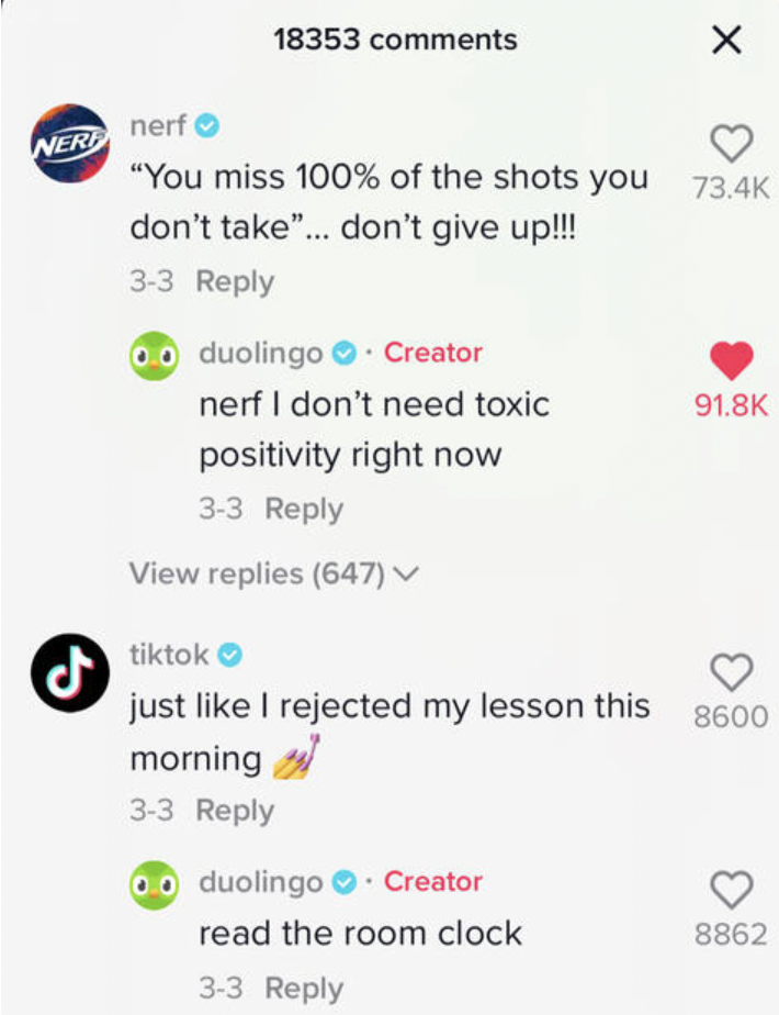 Duo does not just post and log off. He stays active by responding to comments on his videos and jumping into conversations on other creators’ posts. Often this means playfully “starting beef” with other companies online. While this might seem risky, it works because the tone is lighthearted and fun. These interactions bring attention back to Duolingo and make people feel like the brand has a genuine personality. In a space where overly corporate tones can feel stiff, Duo thrives by keeping it human. Whether or not you have a mascot, this lesson holds true: respond to comments and show your audience you are listening.