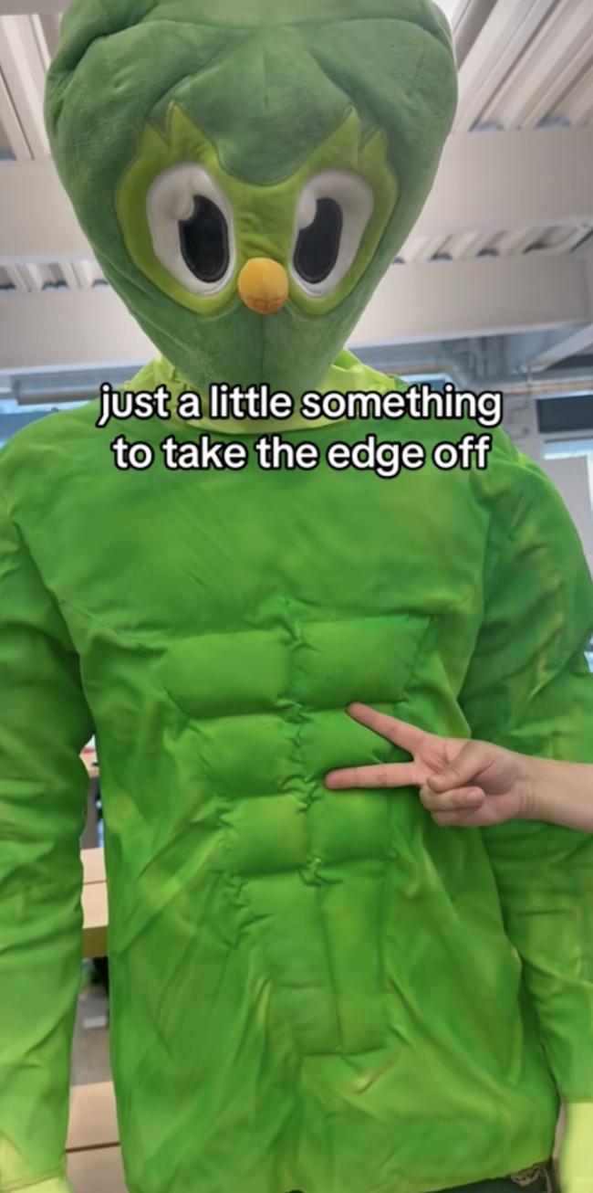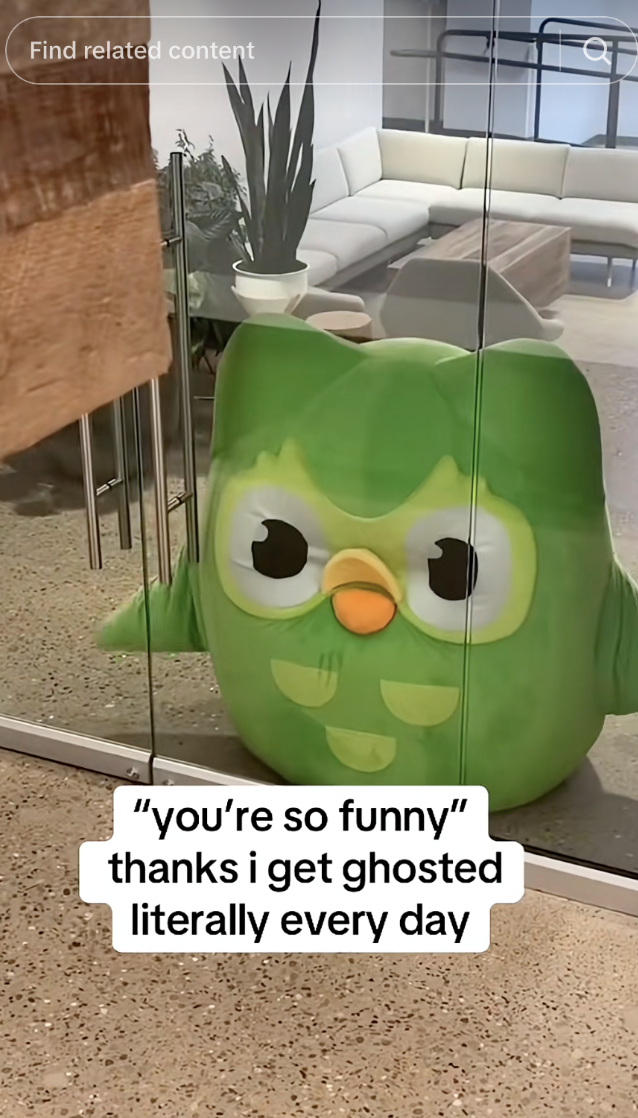 One of the most effective things Duo does is physically take part in viral content. At Duolingo’s marketing offices, people dress in the mascot costume and jump into TikTok trends, whether it is a dance, a skit, or a lip sync. The owl commits fully to the moment, and that commitment pays off. Even if you cannot recall exactly what Duolingo teaches, you will remember a giant fluffy green owl crying while doing the “you’re so funny” trend. It is a clever blend of humor, visual memorability, and trend association. This is a strategy any brand could try, make your mascot a personality that audiences look forward to seeing in their feeds.